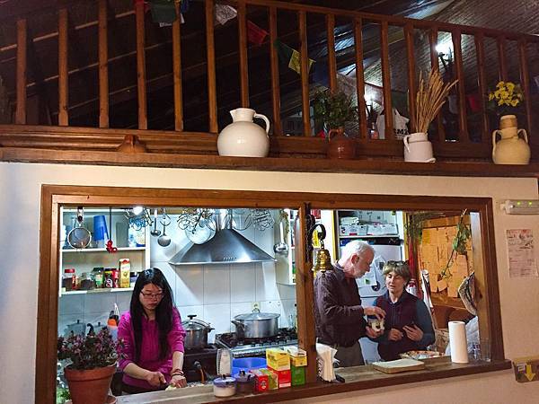 我在廚房幫忙! 旁邊的是提供這個場地的夫婦~伯伯是西班牙人~太太是美國人~不太會西文~曾經走過這段路~覺得很有感觸~所以回來找到這個地方~當作提供給大家的庇護所~讓大家可以安心歇息~