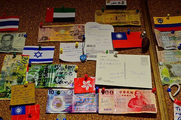 送給老闆吊在那他那面已經集結了很多不同國家的人的留言及紀念品的板子!