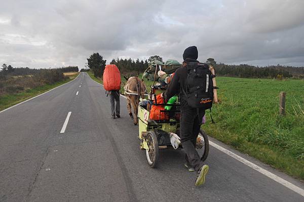 所以他就買了驢子來拖這台拖車把狗狗放上去開始要準備從他家開始走到SJPP
