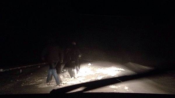 他們下車試圖得想看看能不能把雪撥開~可是根本不可能~