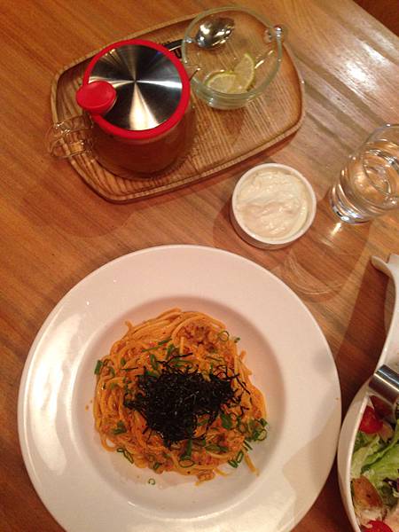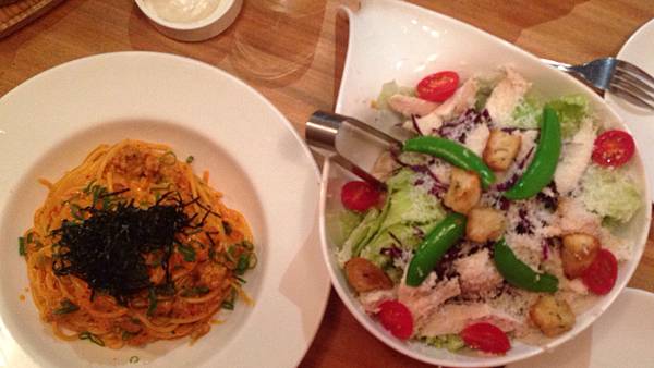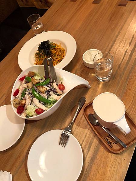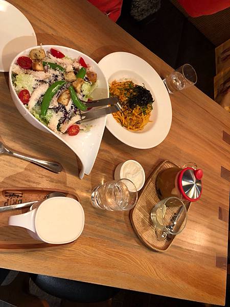 用餐的部分我們是點了一份沙拉~一份麵 還有一份甜點~