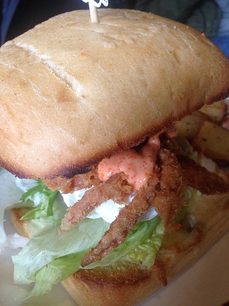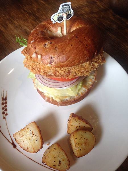 我跟友人K 藍帶豬排沙沙醬三明治 搭配貝果~貝果不知道可不可以選~忘了問~