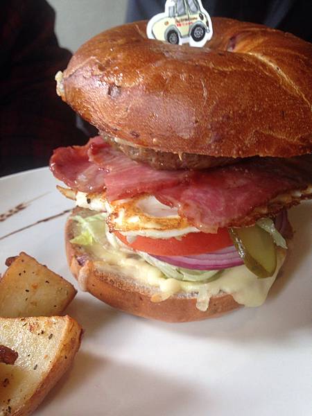 也是配貝果~整份份量也是很大~他很豪邁地拿起來整份咬~