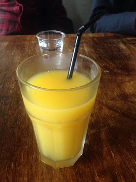 我們選了柳橙汁~跟紅茶(冰跟熱)~聽說冰紅茶很甜~友人朱加了超多水在他的飲料裡面~