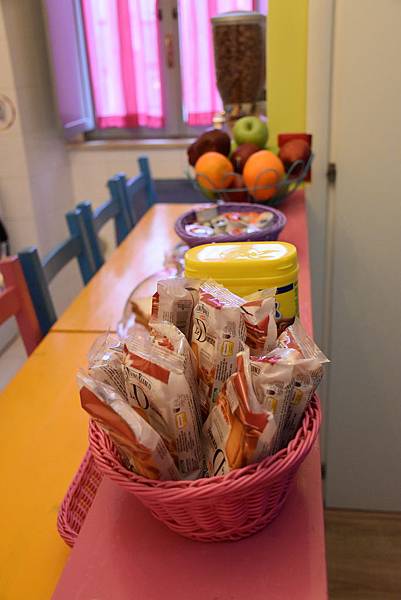 廚房內有果醬蜂蜜巧克力醬還有麵包可頌水果等~主要是早餐~