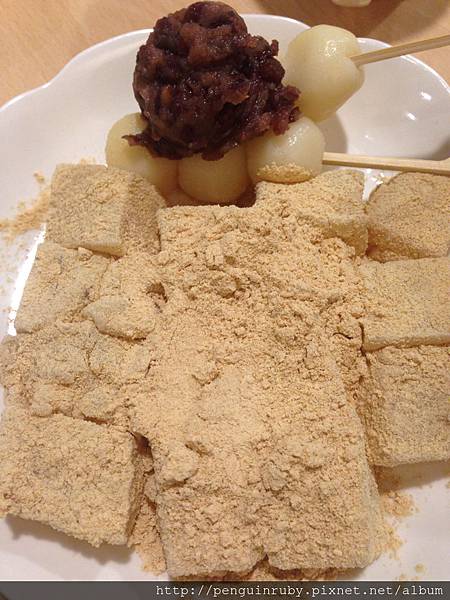 上面灑滿黃豆粉~加上一小杯的黑糖~
