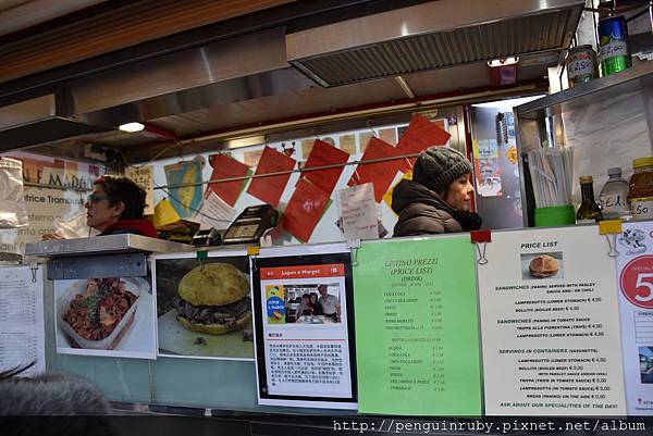 中央市場外,被皮件市集包圍的牛肚包攤,還有中文捏,可以選要夾麵包還是盒子裝的。
