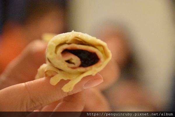 將餅皮裡面包餡料然後捲起來。