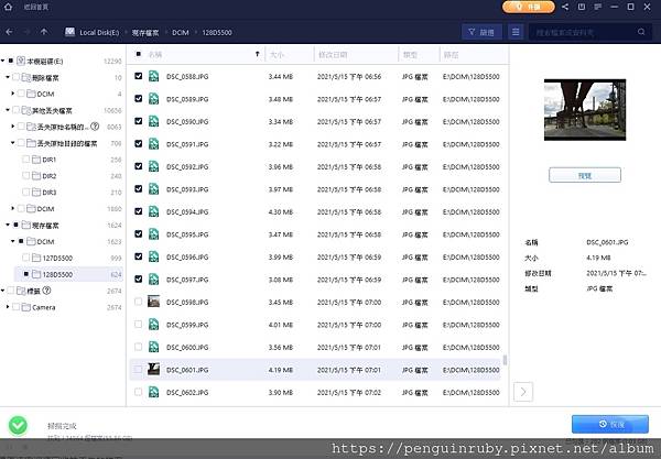 最後,的確恢復的大部分的檔案,除了小部分大約20來張照片找不到。