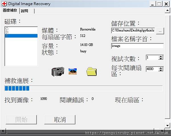 下載完成打開就長這樣,然後在磁碟選你要復原的卡槽,然後復原的檔案想儲存的位置,