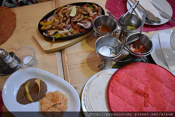 -餐一:鐵板什麻肉 搭配四種醬料(額外單點額外計費喔)+餅皮三片+墨西哥飯配兩片玉米片+紅豆泥